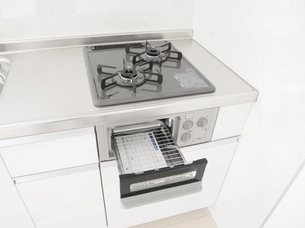 ガス(都市ガス)、インターホン(TVモニター付き)、オートロック、専用ゴミ置き場(あり)、駐輪場、日当り良好、2面採光、全室向き(南向き)、南向き部屋数(2室)、南向きリビング、通風良好、フローリング、全居室フローリング、ベランダ・バルコニー、収納スペース、クローゼット、クローゼット数(1)、玄関収納、全居室収納、押入れ、下駄箱、バス・トイレ別(別室)、シャワー、追い焚き、オートバス、脱衣所、ウォシュレット、洗面台、洗面所独立、シャンプードレッサー、洗面所にドア、洗濯機置き場(室内)、ガスコンロ設置可、ガスコンロ口数(2)、コンロ種類(都市ガス)、グリル、システムキッチン、エアコン、エアコン台数(1)、24H換気システム |