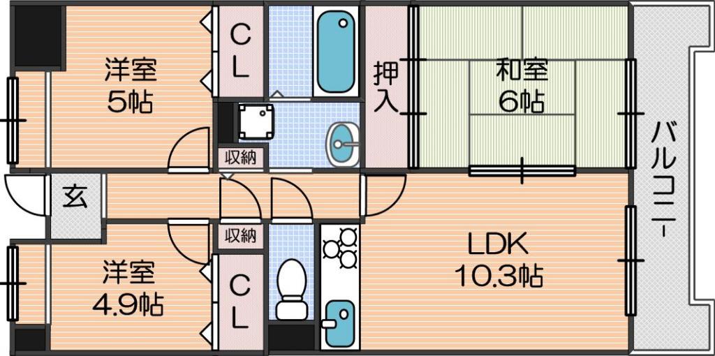 | 間取り詳細 | LDK 10.3畳 、洋室 4.9畳 、洋室 5畳 、和室 6畳 |