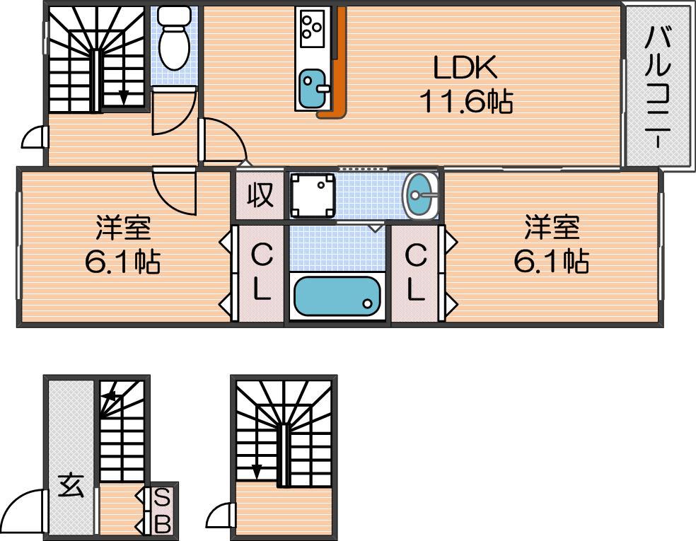| 間取り詳細 | LDK 11.6畳 、洋室 6.1畳 、洋室 6.1畳 |