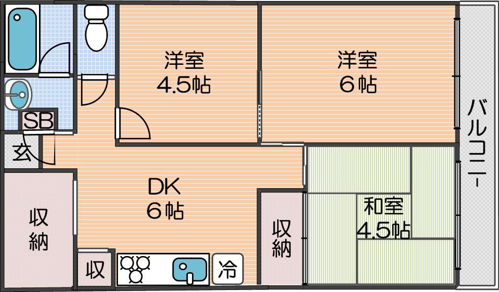 | 間取り詳細 | 洋室 4.5畳 、洋室 6畳 、和室 4.5畳 、DK 6畳 |