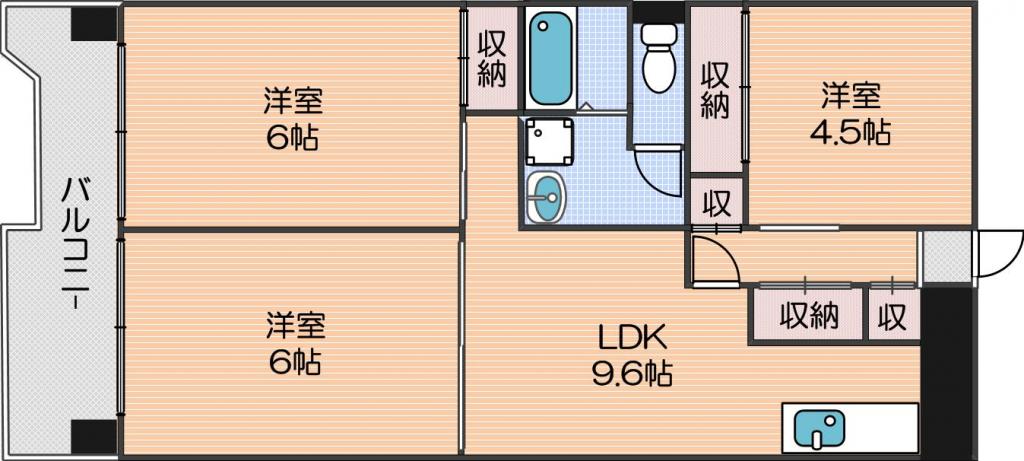 | 間取り詳細 | 洋室 4.5畳 、洋室 6畳 、洋室 6畳 、LDK 9.6畳 |