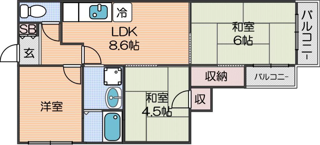 | 間取り詳細 | LDK 8.6畳 、和室 6畳 、和室 4.5畳 |