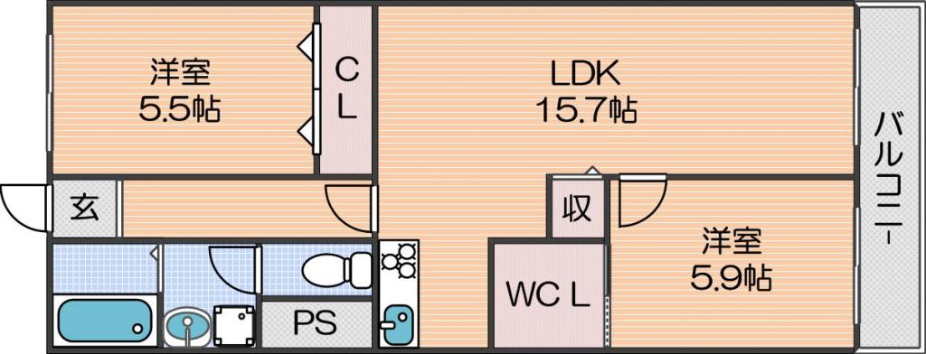 | 間取り詳細 | LDK 15.7畳 、洋室 5.9畳 、洋室 5.5畳 |