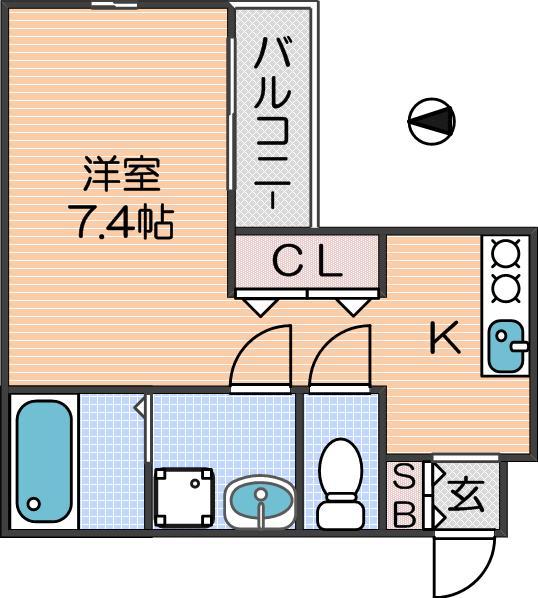 K 2畳 、洋室 7.4畳