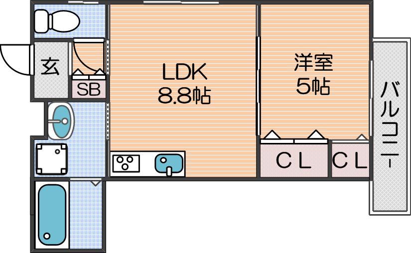 LDK 8.8畳 、洋室 5畳